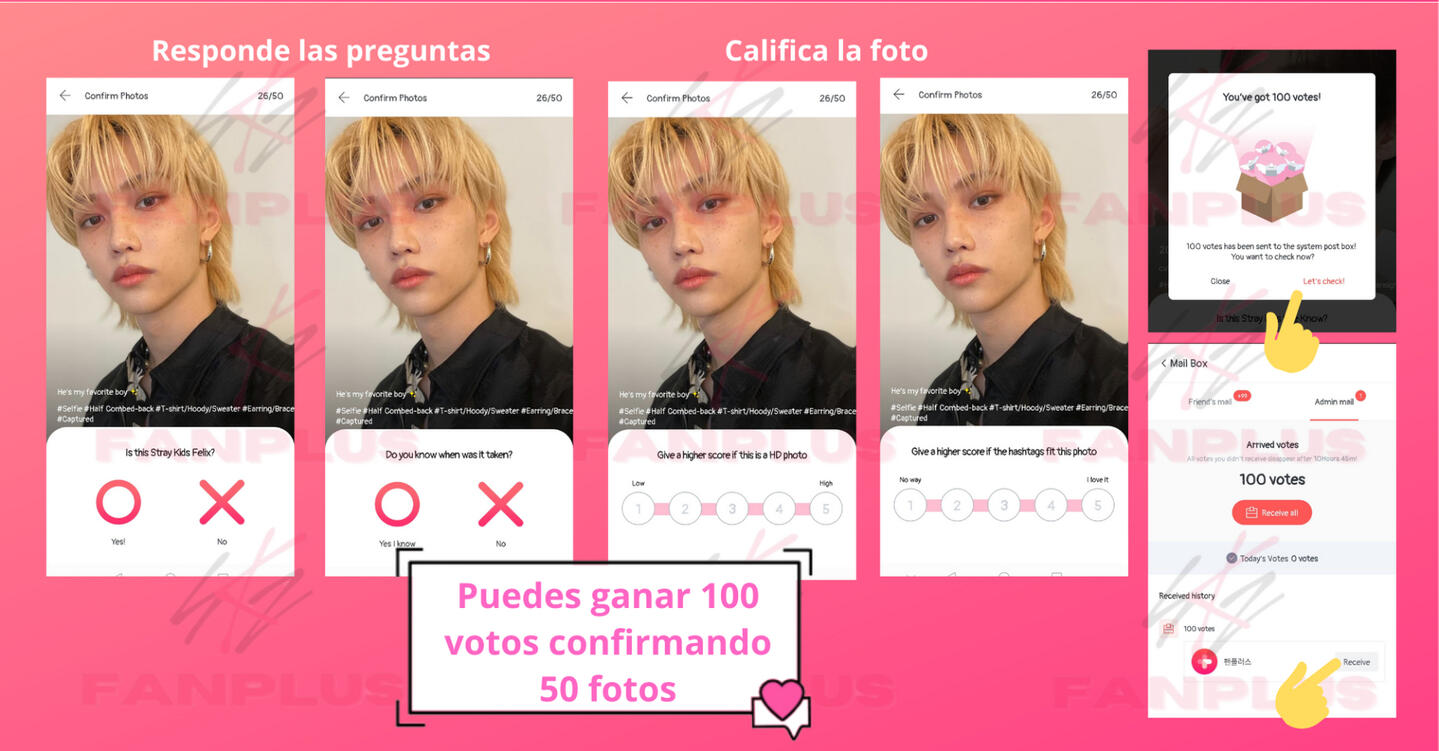4.) Confirma 50 fotosObtén votos confirmando 50 fotos ; (se ganan una vez cada día) y ayuda a otros STAY a ganar votos subiendo fotos para que otros las puedan confirmar también.